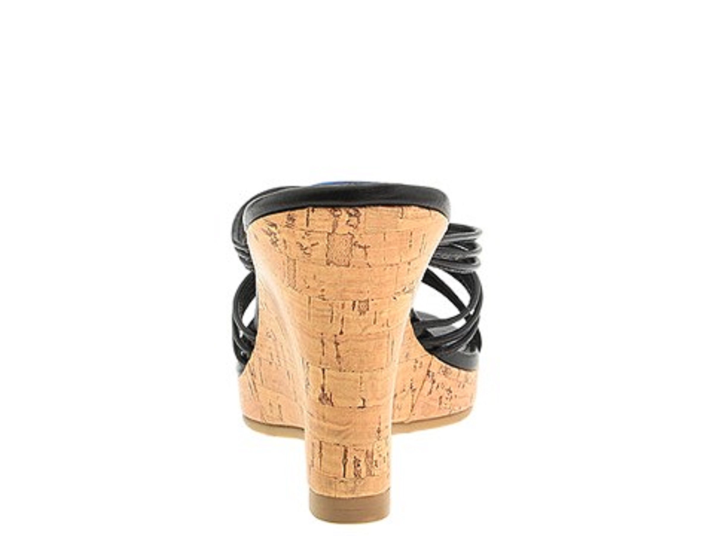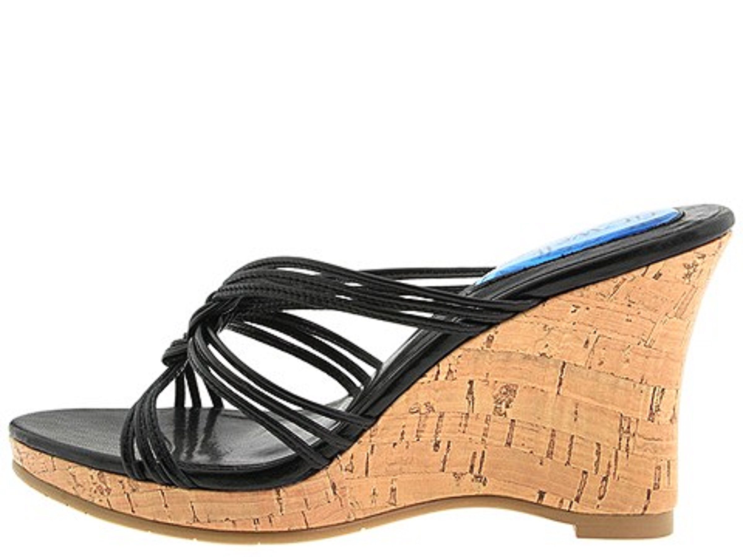 • Sinewy straps intertwine to form a knotted design in this cork-lined platform.